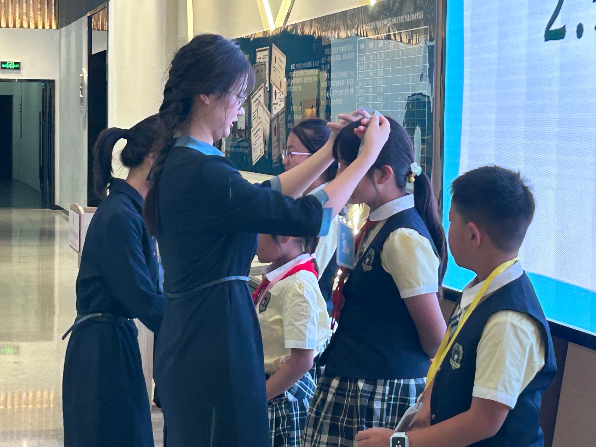 活动伊始,由博物馆大学生讲解员亲手为前期培训合格的小学生讲解员佩戴讲解员工作证。接着,小小讲解员分别前往“见形”“见灵”“见神”展厅,正式“上岗”。他们绘声绘色地科普展品相关知识,生动精彩的讲解赢得了现场观众和工作人员的热烈掌声。